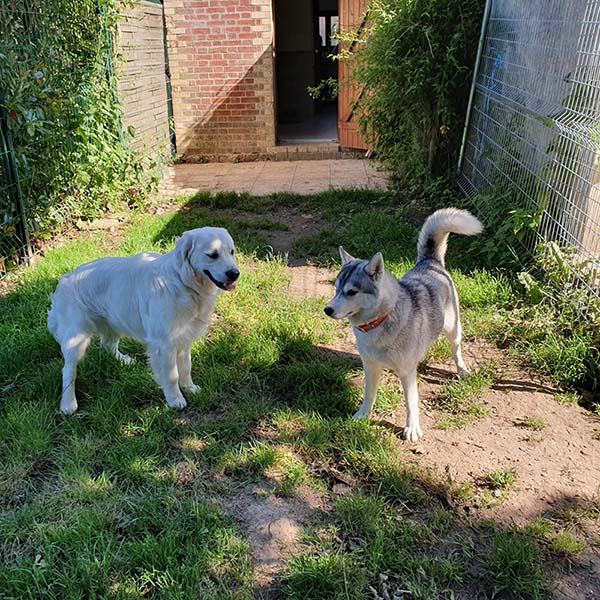 ont accès aussi à notre parc de détente de 1200m2 entièrement clôturé, où ils peuvent courir en toute liberté, jouer avec des congénères ou simplement se poser.